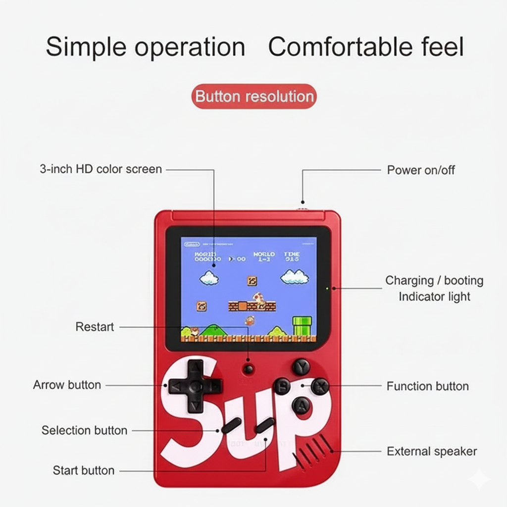 The SUP Game Box Plus comes loaded with 400 classic retro games for nonstop fun 🎮✨. Its compact, lightweight design makes it perfect for travel or home gaming, with a bright color screen and easy-to-use controls for smooth gameplay. Just charge and enjoy your favorite childhood games anywhere, anytime 😍🔋.